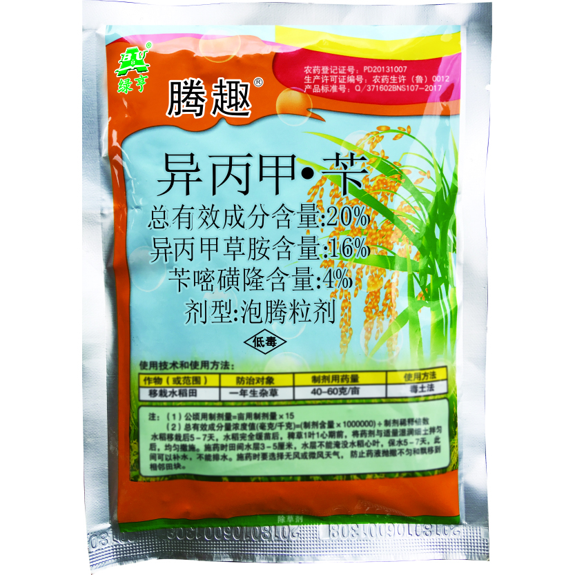 本品采用对禾本科杂草活性较高的异丙甲草胺和对阔叶杂草、莎草高效的苄嘧磺隆复配而成。具有活性高、杀草谱广、除草效果好、使用方便等特点。本品又为泡腾粒剂,新剂型,产品内含各种成分的助剂,再经精细加工,药剂能在水中自动扩散。