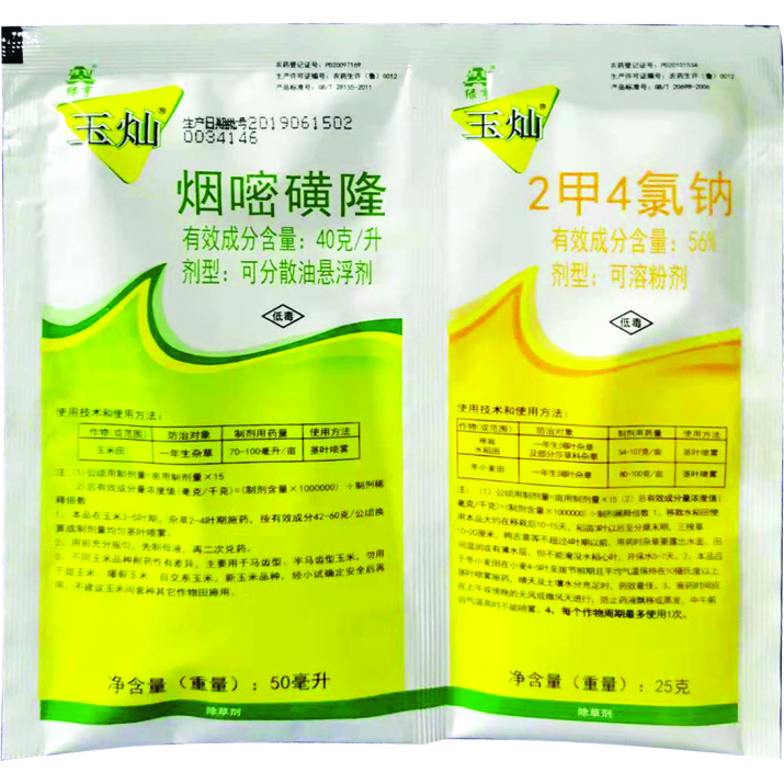产品成分:40克/升烟嘧磺隆可分散悬浮剂+56% 2甲4氯钠可溶粉剂