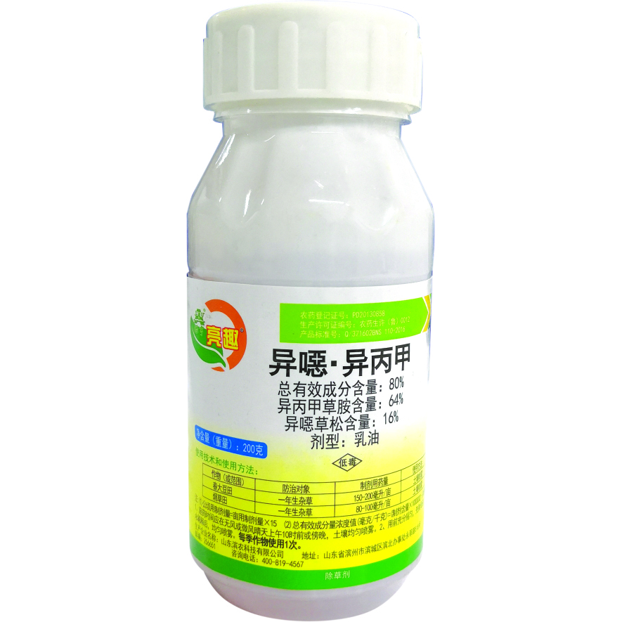 本品是二元复配除草剂,其中异丙甲草胺不烧根,不伤苗;二元复配后减少了异噁草松的用量,具有不同作用的杀草机制,能有效防除马唐、旱稗、牛筋草、狗尾草、马齿苋、反枝苋、铁苋菜、藜和自生麦苗等,能有效防除烟草田及春大豆田一年生杂草。